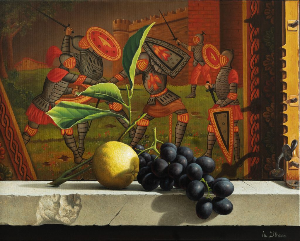 Il dipinto, uno still life, rappresenta una composizione di frutta posta su di un marmo bianco, vissuto ed usurato. Lo sfondo della composizione è la sponda di un antico carretto Siciliano, rappresentante una scena di battaglia in stile medievale. Il tutto ci riporta a sapori e tradizioni Siciliane.